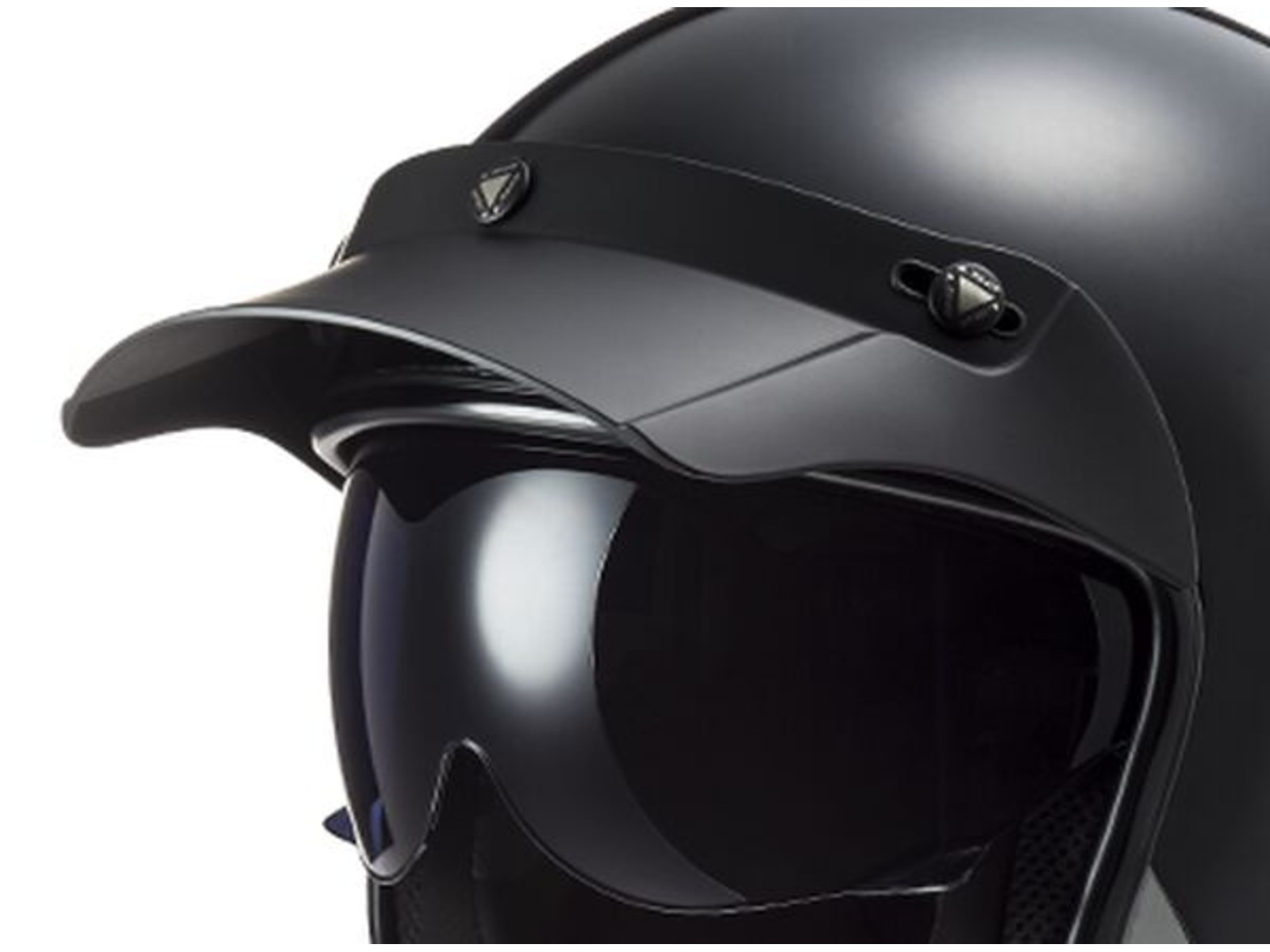 Das Sonnenvisier lässt sich manuell in verschiedene Positionen schieben (oft "Drop-Down" System), um die Augen vor Fahrtwind oder Sonne zu schützen, ohne die klassische Optik zu stören.