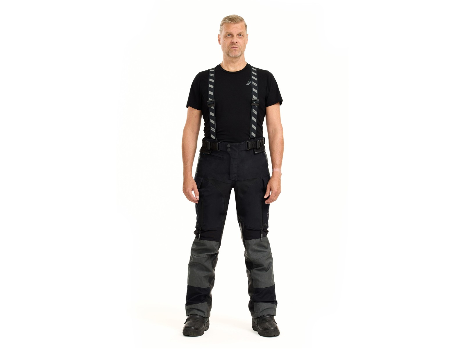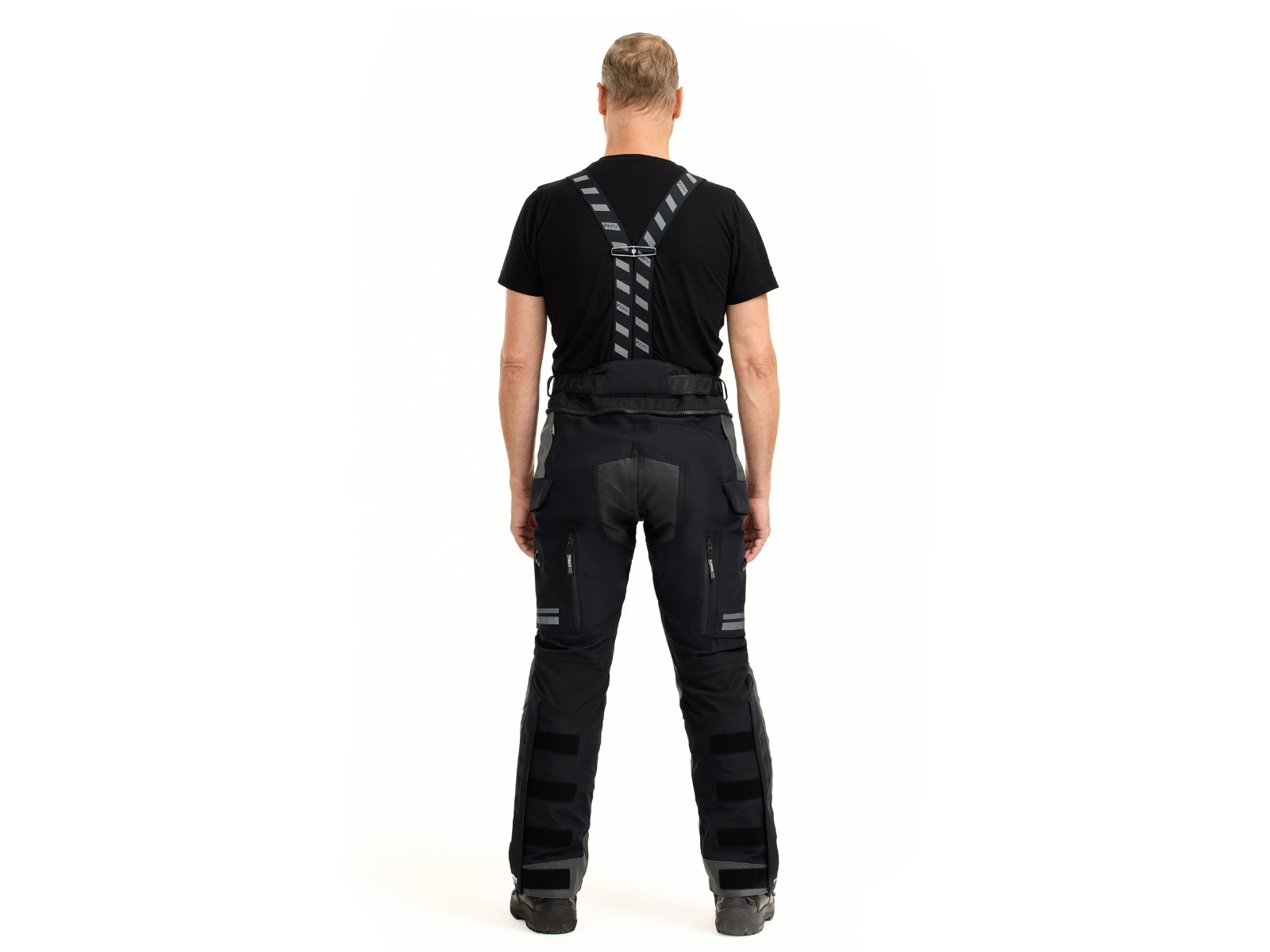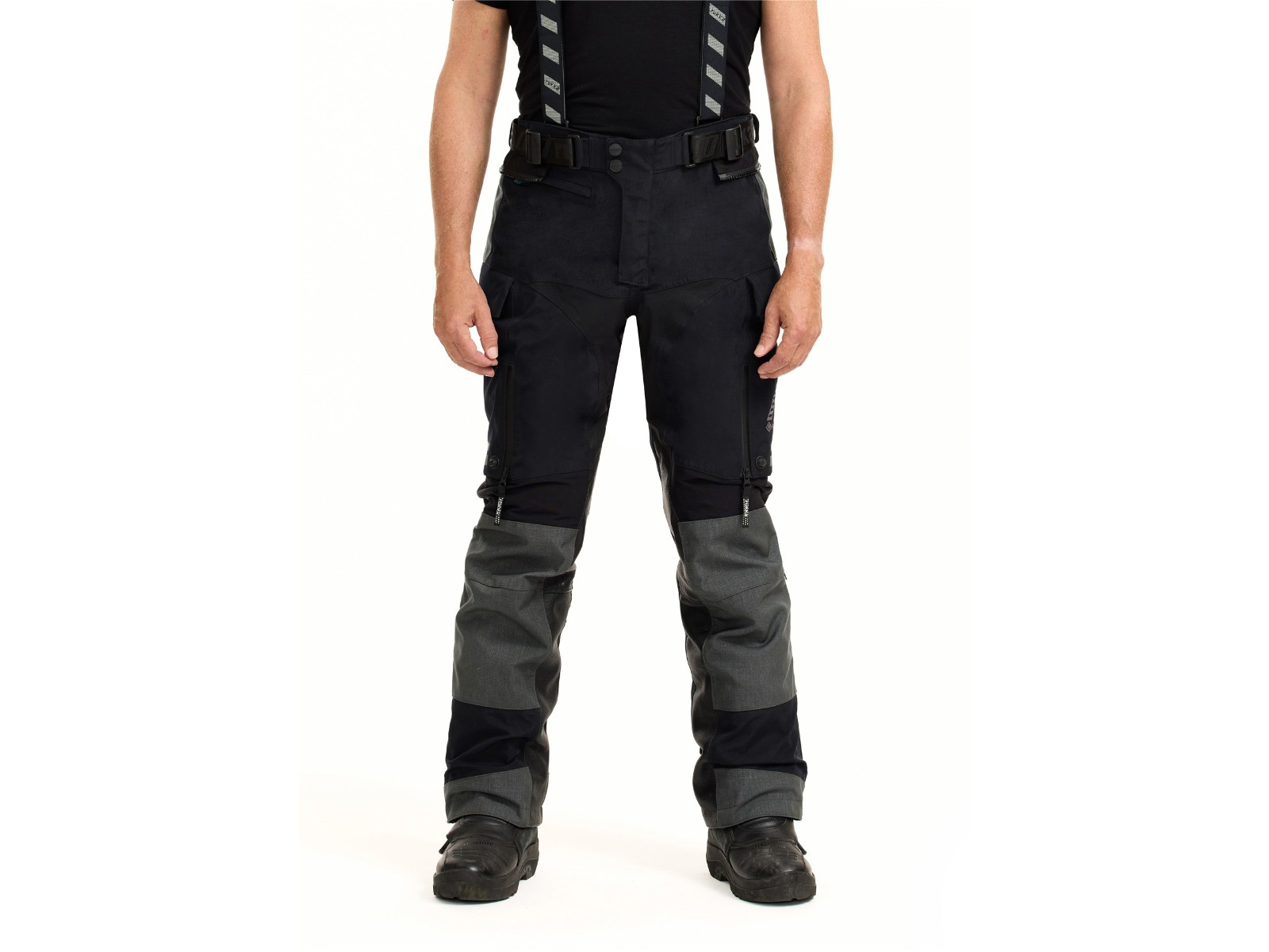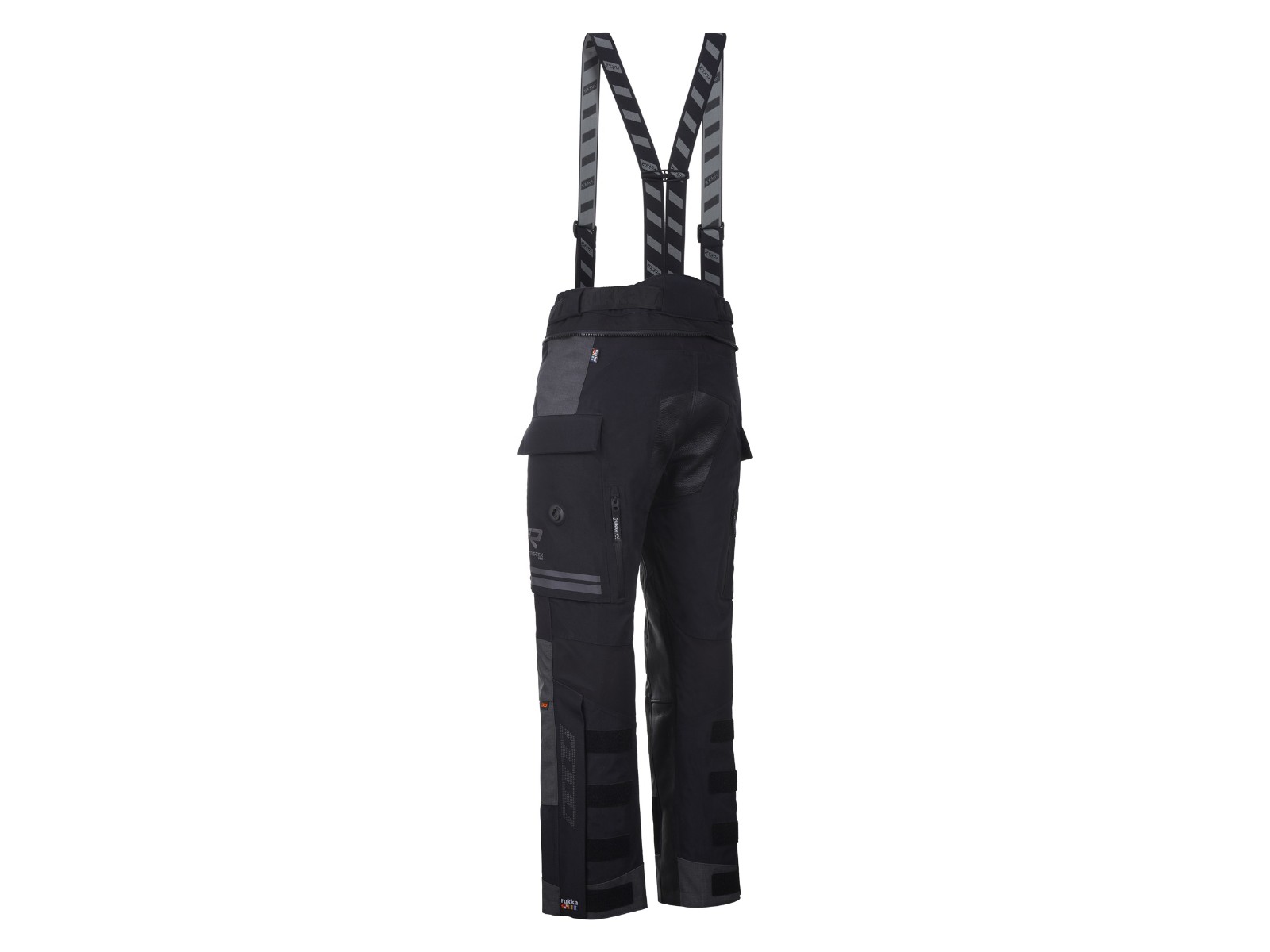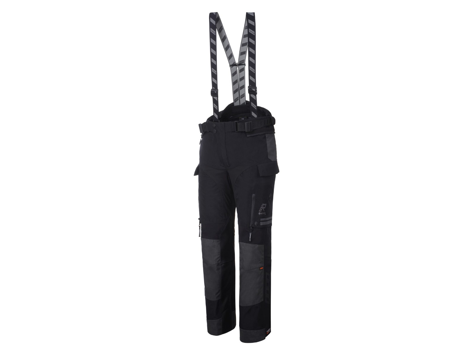 Passform: Verstellbarer Taillengurt, Beinabschlüsse mit Reißverschluss/Klett (passend für Enduro-Stiefel) und abnehmbare Rukka Defence & Comfort Hosenträger.