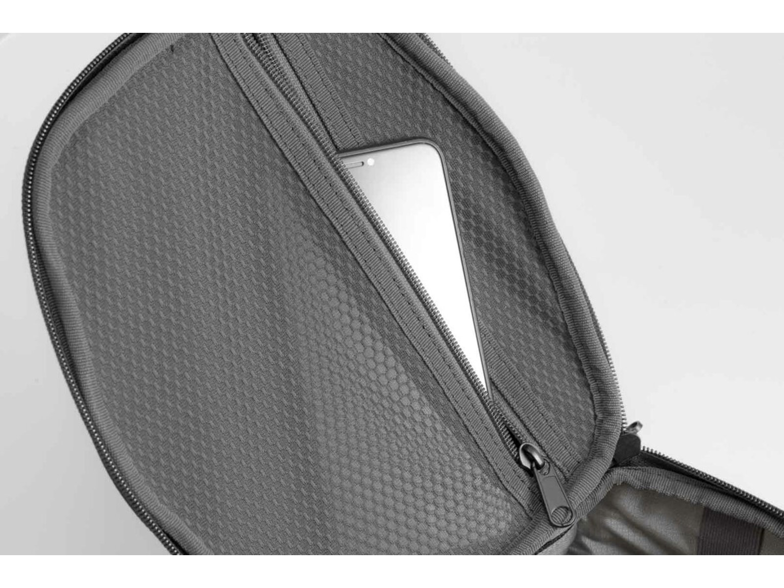 - Oberseite und Boden des Tankrucksacks aus laminiertem und formstabilem EVA-Material